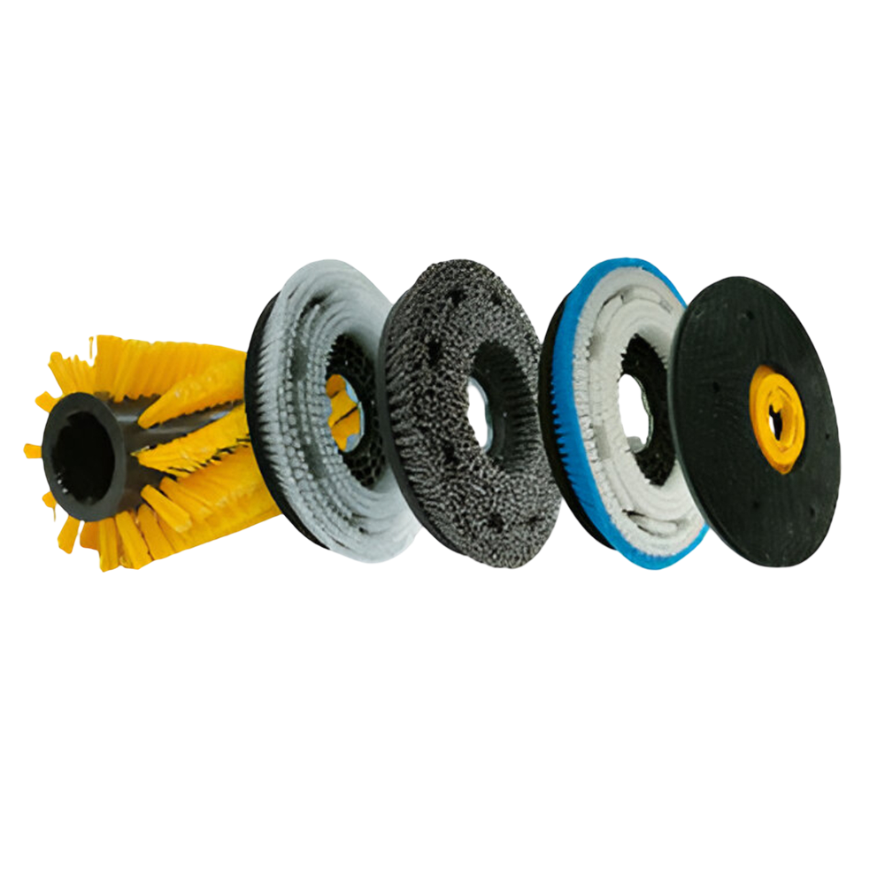 - Cepillos disco con diversas opciones de grosor (de 0,3 a 1,0) y una variedad de cerdas (PPL, Nylon, Tynex, Sisal) para lavadoras secadoras, barredoras y máquinas monodisco.
